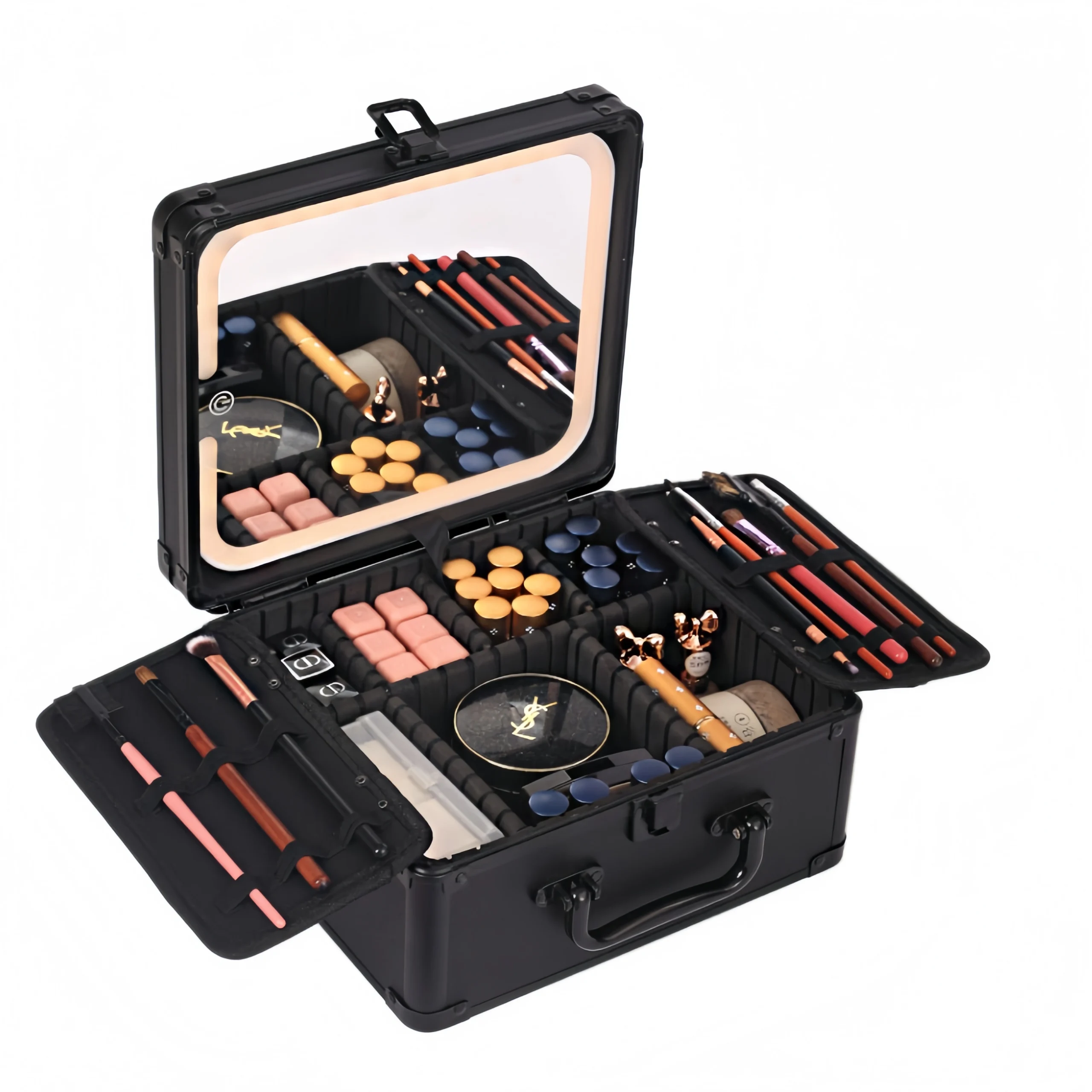 LED makeup vanity case with mirror and adjustable dividers, designed to organise cosmetics, brushes and beauty essentials for home use, travel and gifting.